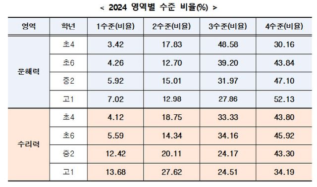 서울시교육청이 14일 발표한 ‘2024 서울 학생 문해력·수리력 진단검사’ 결과에 따르면, 수리력 우수 수준(4수준) 비율이 초4 43.80%에서 고1 34.19%로 크게 하락했다.