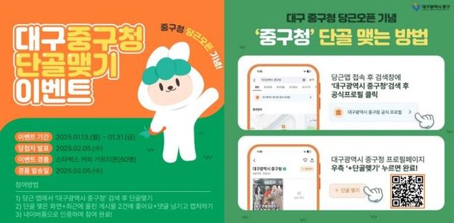 한편, 중구는 블로그와 인스타그램 등 5개의 SNS를 운영하며, 지난달 대구지역 지자체 최초로 당근 공공프로필을 개설해 다양한 정책과 소식을 알리고 주민 의견을 수렴하는 양방향 소통 플랫폼으로 활용하고 있다.