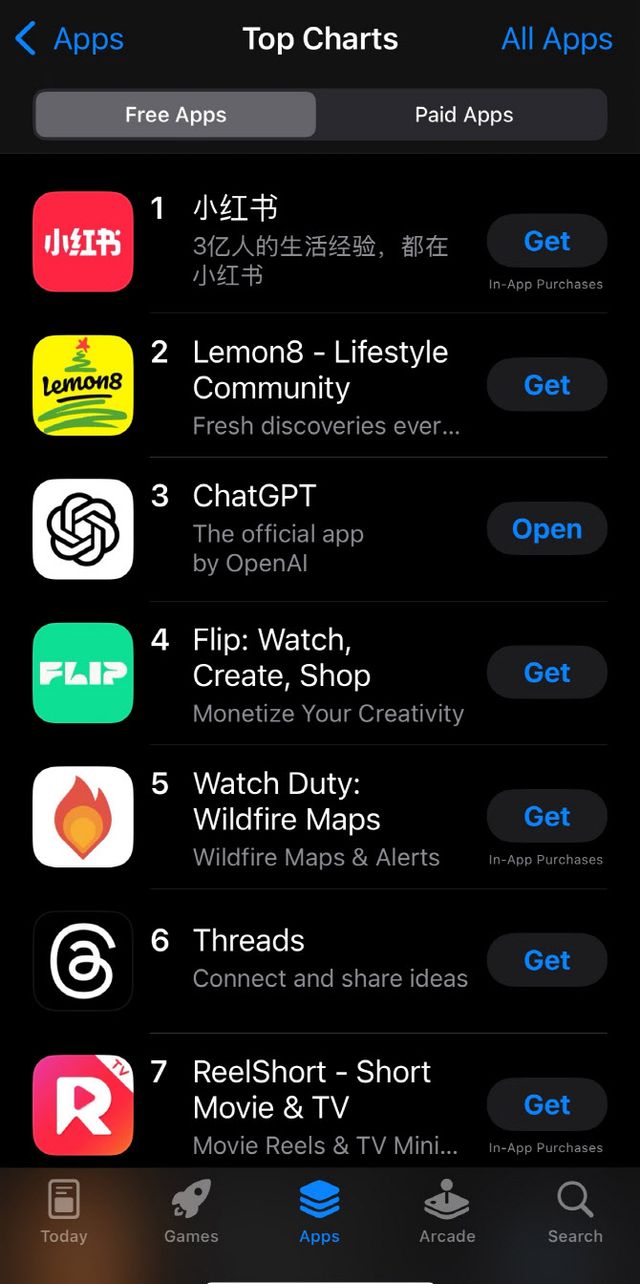 바이트댄스가 소유한 또 다른 소셜미디언인 레몬8이 2위, 생성형 인공지능(AI) 모델인 챗GPT가 3위 등으로 뒤를 잇고 있다.