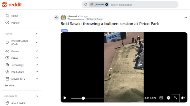 14일(한국시간) 미국의 한 유명 커뮤니티에는 사사키가 펫코파크에서 투구하는 영상이 올라왔다.