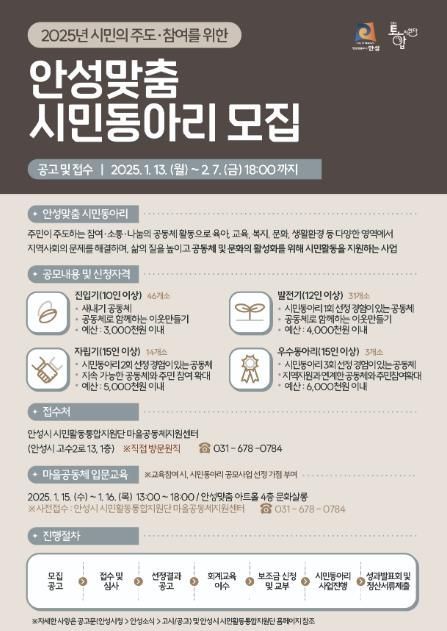[와이뉴스] 안성시 시민활동통합지원단 마을공동체지원센터는 지난13일에 ‘2025년 주민주도·참여를 위한, 안성맞춤 시민동아리 지원 공모사업’(이하 시민동아리)을 공고했다.