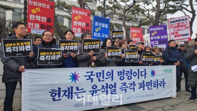 윤석열 즉각퇴진 사회 대개혁 비상행동(비상행동)은 14일 오후 1시 서울 종로구 헌법재판소 앞에서 기자회견을 열고 윤 대통령에 대한 헌재의 윤 대통령 파면을 촉구했다. 이날 오후 2시에 열린 윤 대통령 탄핵 심판의 첫 정식 변론기일에 맞춰 헌재와 윤 대통령에 대해 압박에 나선 것이다.