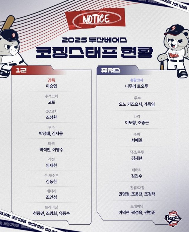 두산 베어스가 14일(화) 2025시즌 코칭스태프 보직을 확정했다.
