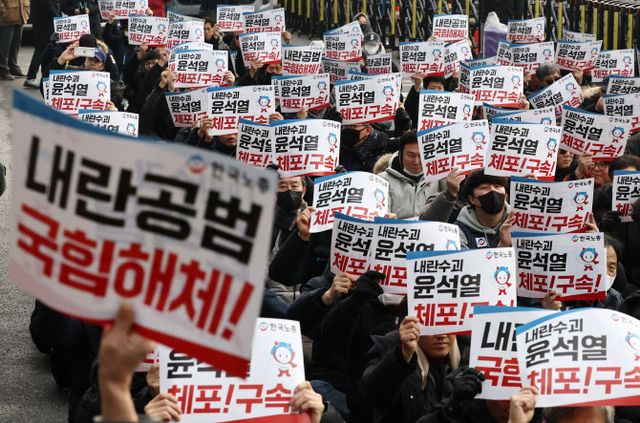 김성훈 대통령 경호처 차장에 대한 체포영장이 발부됐다는 소식엔 탄식이 흘러나왔다. 집회 사회자는 “윤 대통령은 전문가들과 정상적인 경호 활동이 가능할지 판단한 뒤 (대통령실) 수석이나 실장을 보내서 우리를 모두 경호원으로 임명하시길 바란다”며 “우리가 임명되면 관저 밖에서 목숨 바쳐 경호 업무를 수행할 것”이라고 목소리를 높였다.