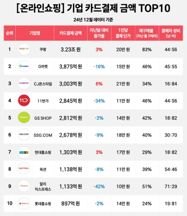 다만 온라인 쇼핑몰 별로 카드 결제 금액 감소율은 큰 차이를 보였다. 특히 남성 소비자 비율이 높은 온라인 쇼핑몰일수록 불황 영향을 더욱 많이 받은 것으로 나타났다. 남성 비율이 71%에 달하는 알리 익스프레스의 지난달 카드 결제 금액은 1133억원으로 전월 대비 42%나 감소했다.
