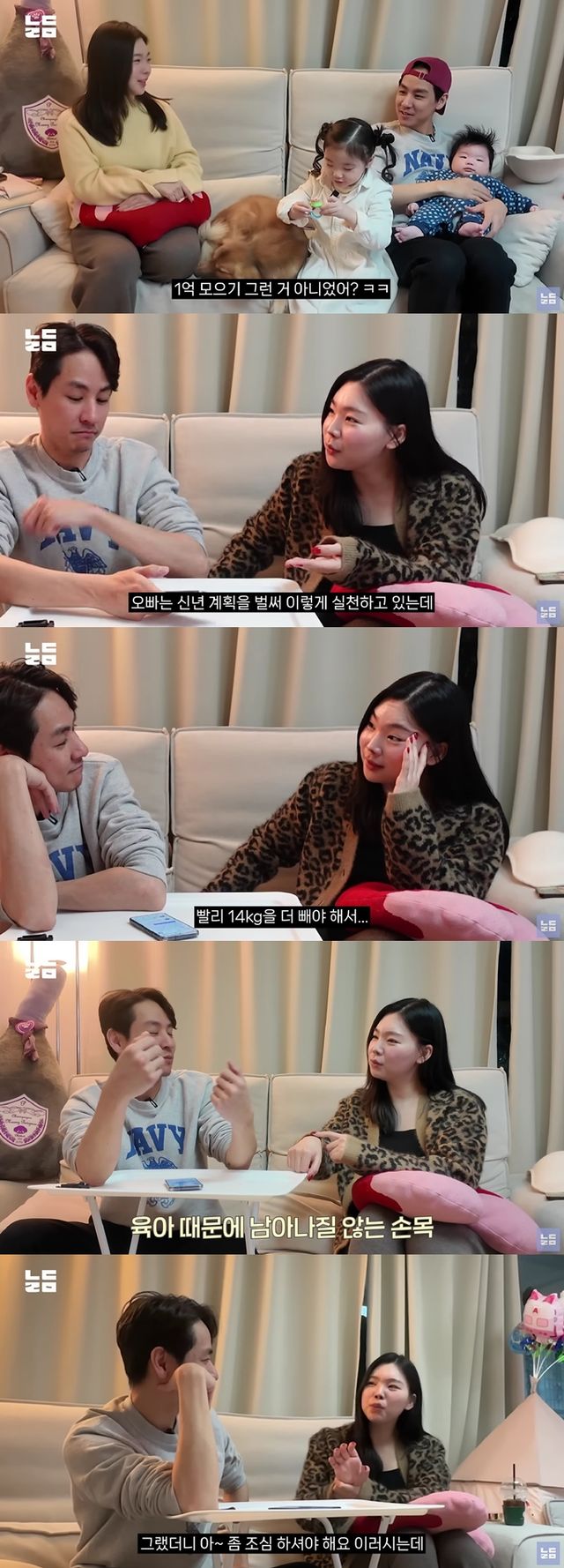 영어공부가 목표라는 윤남기는 외국인 친구와 프리토킹하는 등 목표달성을 위해 실천하는 모습을 보여주자 이다은은 "나도 빨리 14kg를 빼야 하는데"라며 "갑자기 또 손목 통증이 생겼다"라며 육아로 생긴 통증에 안타까워했다. 윤남기는 "우리 집에 손목 보호대만 3개다"라고 거들었다.