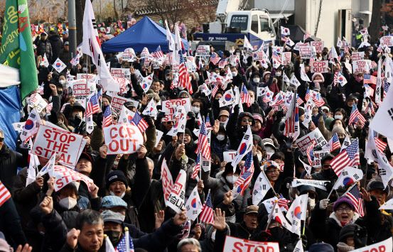 이날 서울 용산구 한남동 육교 건너편에는 이른 아침부터 윤 대통령 지지자들이 탄핵 반대집회를 열었다. 참가자들은 태극기와 성조기를 손에 들고 모자와 목도리 등으로 온몸을 감쌌다. 기온이 영상으로 올라간 낮부터 참가자들이 늘면서 집회 분위기도 고조됐다.