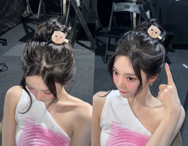 가장 먼저 공개된 사진 속 닝닝은 SMTOWN 굿즈 티셔츠를 리폼해서 입은 모습이다. 특히 가녀린 어깨라인을 드러내는 스타일로 연출해 눈길을 끌었다. 또 다른 사진에서는 이날 에스파가 선보인 f(x) '첫사랑니' 리메이크 무대 착장 등도 담겨 있어 사랑스러운 매력을 더한다.