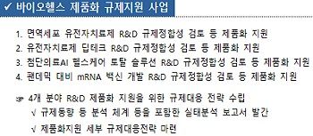 ‘바이오헬스 제품화 규제지원 사업’은 지난해 6월 제3차 바이오헬스혁신위원회에서 선정한 다부처 협업 국가연구개발사업 5개 분야[①(첨단재생의료) 면역세포 유전자치료제 전주기 개발, ②(첨단재생의료) 유전자치료제 딥테크 연구개발 지원, ③(디지털 바이오헬스) 사용자 중심 보건의료 데이터 활용 활성화, ④(디지털 바이오헬스) 첨단의료 AI 헬스케어 토탈 솔루션, ⑤(감염병 백신) 팬데믹 대비 mRNA 백신개발 및 신속개발체계 구축 지원]의 제품화 성공률을 높이기 위해 식약처에서 향후 6년간 추진하는 규제지원 사업(6년간 총 57.5억 지원)이다.