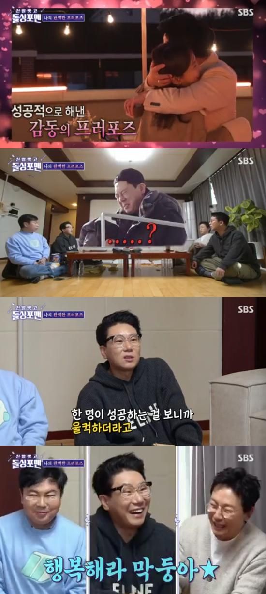 김준호는 "프러포즈 영상을 보고 장훈이 형도 울었다고 하더라. 그러고 보니 돌싱들만 울더라"고 말해 웃음을 자아냈다.