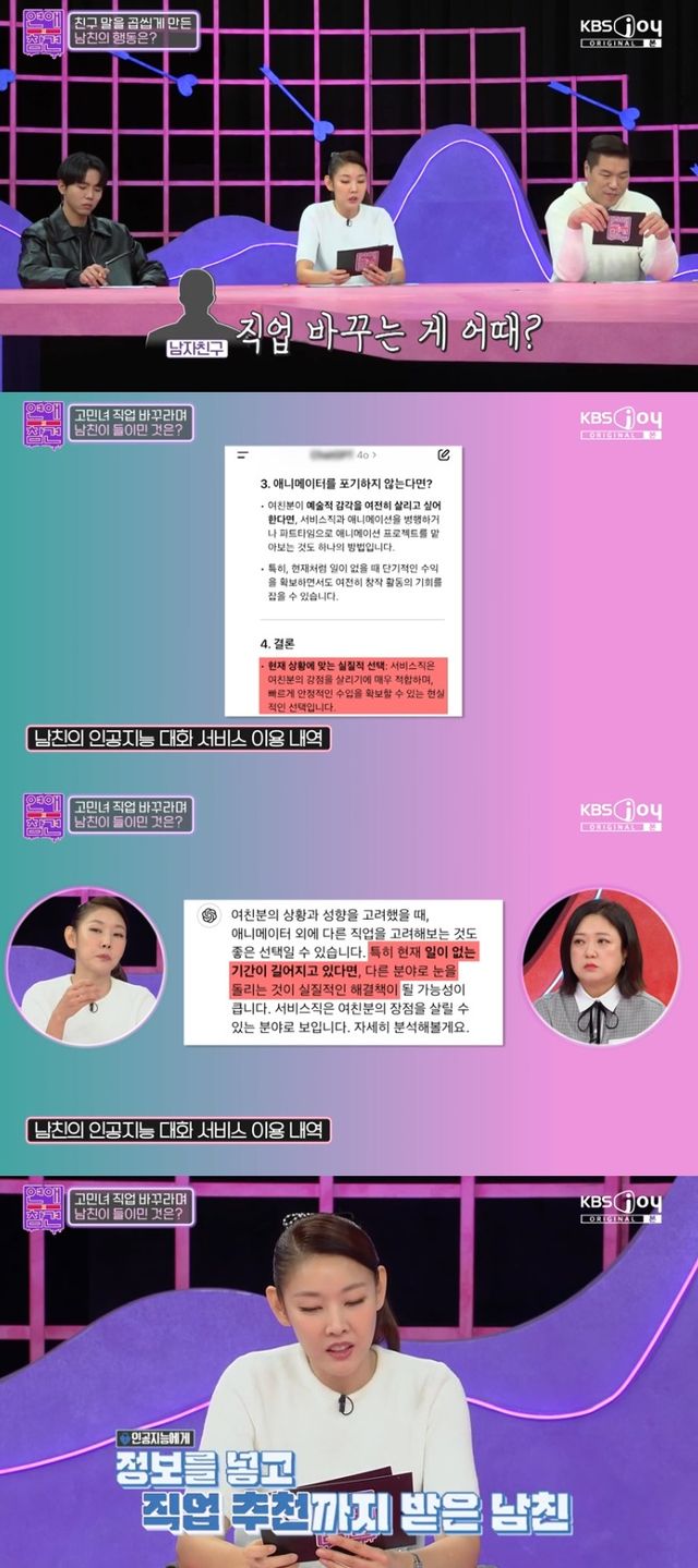 문제는 여기서 그치지 않았다. 남자친구는 "직업을 바꿔보는 거 어때?"라며 "내가 봤을 때 너는 애니메이터보다 서비스직이 맞는 거 같다"고 직업까지 회유했다. 급기야 남자친구는 인공지능 대화 서비스를 통해 얻어낸 정보로 고민녀에게 다른 직업을 권하며 적극적으로 간섭하기까지.