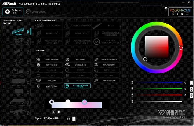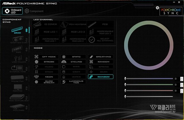 메인보드 제조사마다 지원하는 RGB 소프트웨어와 동기화되므로 RGB를 지원하는 주변의 하드웨어와 동일한 조명효과를 부여할 수 있는 것은 물론이다. ADATA의 하드웨어 위주로 구성된 PC라면 독자적인 RGB 제어 소프트웨어인 XPG PRIME을 이용해 모든 XPG 시리즈의 RGB를 제어할 수도 있다.