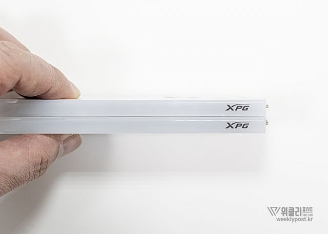 ADATA DDR5-6400 CL32 LANCER BLADE RGB 화이트는 Low Profile 히트싱크 디자인을 적용해 장착 시 메모리의 높이가 상당히 낮다. RGB 라이트 바를 포함해도 높이는 고작 40mm에 불과하다. 고성능 듀얼 타워 쿨러를 장착하는 경우에도 간섭이 발생할 가능성이 그만큼 적은 셈이다.
