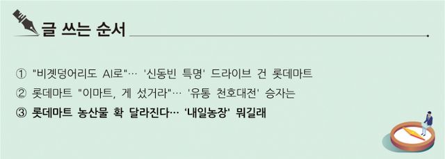 롯데마트와 슈퍼가 농산물 경쟁력을 강화하고 지속가능한 미래를 열어가기 위해 이달 9일부터 '내일농장' 프로젝트를 가동했다. AI 선별 과일, 스마트팜 농산물, 저탄소·친환경 인증 농산물, 기후변화에 대응하는 신품종 농산물 등을 지원하고 확보하는 차세대 농업 프로젝트다.