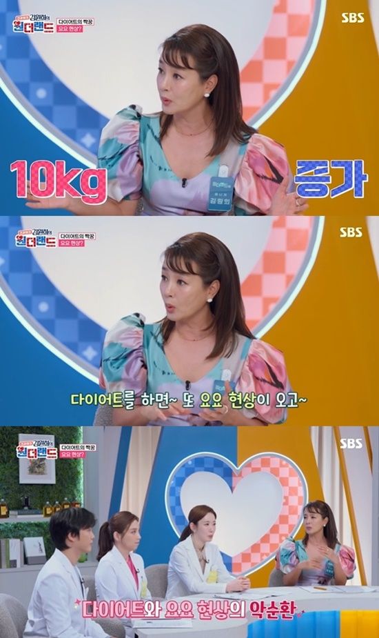 1972년 생으로 50대인 김원희는 '다이어트 경험이 있는 사람 중 64%가 요요현상을 겪었다'는 분석 결과에도 "저도 그 때 10kg 이상이 쪘었다. 다이어트를 하면 요요가 오고, 악순환이 반복되니까 지치게 됐다"고 얘기했다.