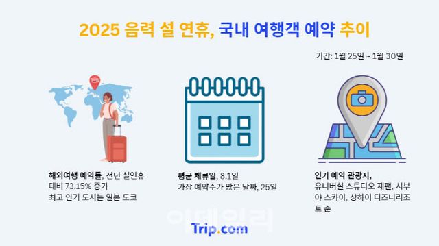 여행 플랫폼 트립닷컴은 지난 음력 설 대비(2024년 2월 9일부터 12일까지) 올해 설 연휴 기간(2025년 1월 25일부터 30일까지) 동안 국내 여행객의 해외여행은 73.15%, 해외 여행객의 국내 여행은 18.16% 늘어날 것으로 예측했다. 이는 지난 6일까지 설연휴기간 여행을 위해 예약된 항공, 숙소, 액티비티 예약률을 합한 수치다.