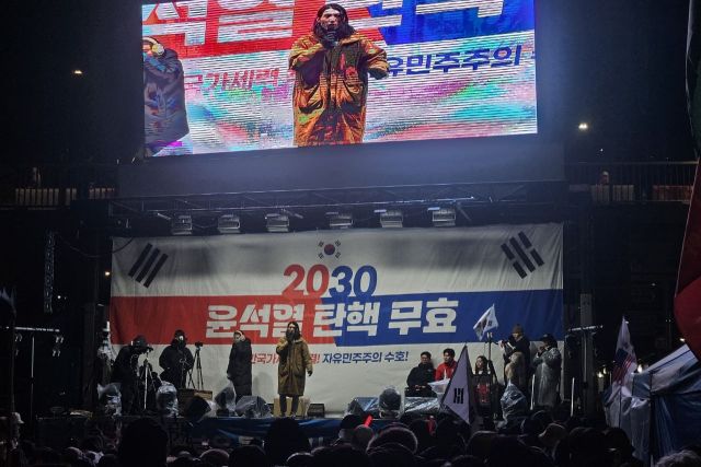 윤 대통령 체포 반대 집회 주최 측은 관저 인근 북한남삼거리 옆 인도에 무대를 설치하고 윤 대통령 지지자들을 독려했다. 무대에 오른 한 발언자는 부정선거론을 주장하며 "당당하게 체포에 반대하자"고 외쳤다. "이 몸이 죽어서 나라가 산다면 아아 이슬같이 기꺼이 죽으리라"는 가사가 담긴 노래가 흘러나오기도 했다.