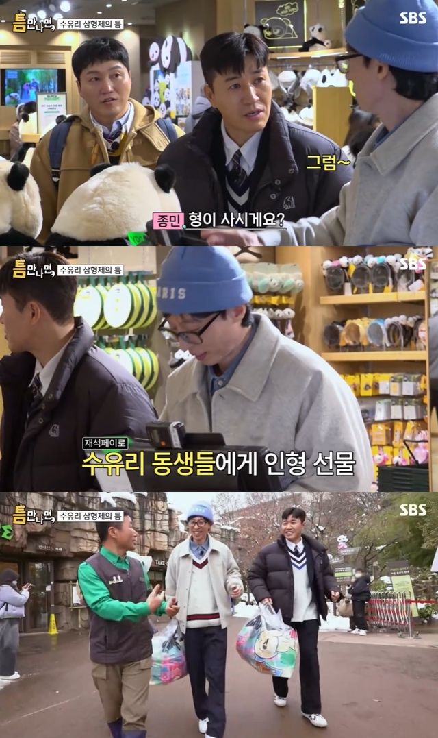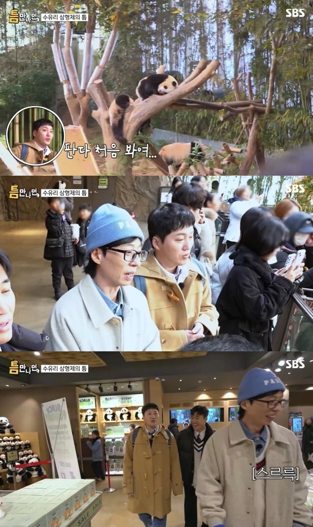 이날 방송에는 결혼을 앞둔 김종민도 등장했다. 세 사람은 에버랜드를 방문해 '푸바오 할부지' 강철원 사육사와 함께 판다월드를 방문했다. 앙증맞은 쌍둥이 판다의 자태에 멤버들은 "귀여워"를 연발했다.