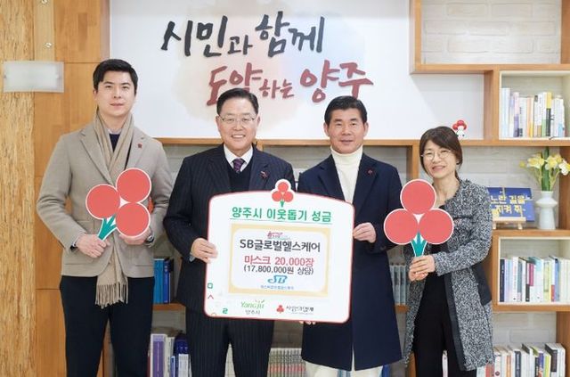 강수현 양주시장은 “어려운 이웃을 위해 큰 나눔을 실천해주신 ㈜에스비글로벌헬스케어의 따뜻한 마음에 깊이 감사드리며, 기부된 마스크는 필요한 곳에 신속히 전달해 지역사회 건강 증진에 기여하겠다”고 밝혔다.