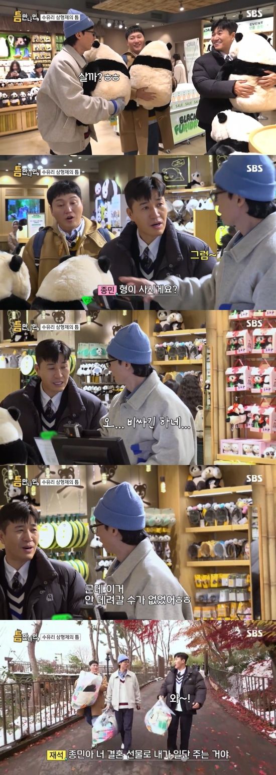 판다 인형을 구매하고 두 번째 틈주인을 만나러 가는 길에 유재석은 결혼을 앞둔 김종민을 향해 "결혼 선물로 주는 거"라고 말해 웃음을 줬다.