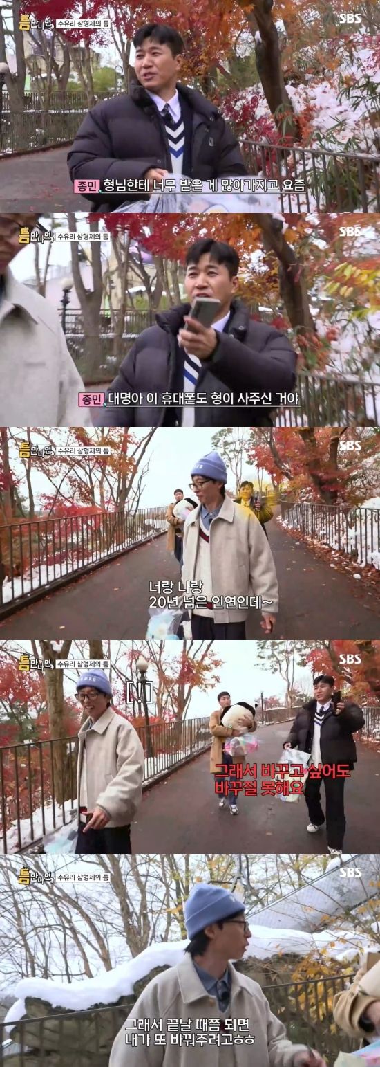 유재석이 "너랑 나랑 20년 넘은 인연이지 않냐"라고 하자 김종민은 "그래서 휴대폰 바꾸고 싶어도 바꾸질 못한다"고 말해 유재석을 당황케 했다.