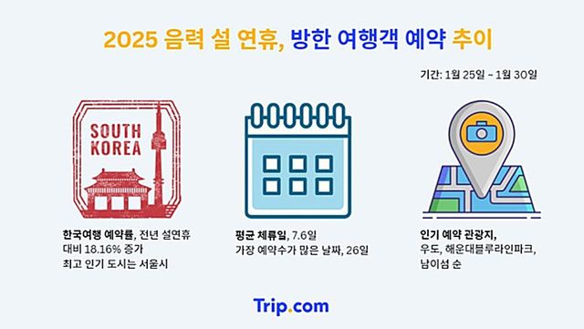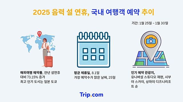 여행 플랫폼 트립닷컴은 지난 음력 설 대비(2024년 2월 9일부터 12일까지) 올해 설 연휴 기간(2025년 1월 25일부터 30일까지) 동안 국내 여행객의 해외여행은 73.15%, 해외 여행객의 국내 여행은 18.16% 늘어날 것으로 예측했다. 이는 지난 6일까지 설연휴기간 여행을 위해 예약된 항공, 숙소, 액티비티 예약률을 합한 수치다.