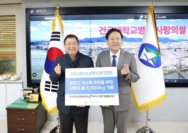 건국대병원은 광진구청과 함께 2006년부터 사랑의 쌀 지원사업을 통해 총 4,730포의 쌀을 기부해 왔으며, 광진구 저소득 주민을 위한 진료비 지원, 대상포진 예방접종비 지원 등 다양한 사회공헌활동을 이어가고 있다.