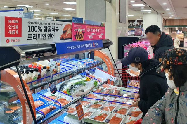 15일 업계에 따르면 롯데마트는 16일부터 연어회(29일까지)·광어회(22일까지)를 할인 판매하며 수산물 초저가에 도전한다. 노르웨이산 ‘내가 만드는 연어’를 엘포인트 회원을 대상으로 100g 기준 횟감용 3990원, 구이용 3710원에 할인 판매한다. 원·달러 환율 급등으로 노르웨이산 연어 필렛 정상가가 지난해 1월 4980원에서 올해 1월 5700원으로 14% 오른 점을 고려하면 30%가량 할인된 수준이다. 광어회도 350g 기준 2만 7840원에 내놓는다.