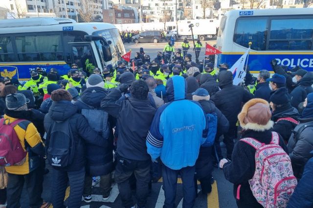 한남동 관저 방향으로 진출하려는 북한남삼거리 앞 윤 대통령 체포 반대 시위대와 이를 막아서려는 경찰 간 대치는 윤 대통령이 공수처에 출석한 후에도 계속됐다.