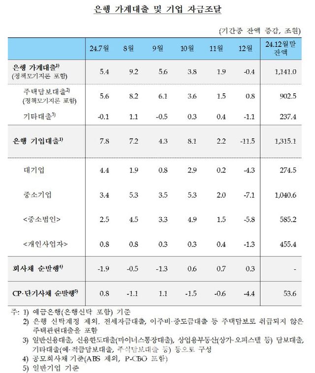 15일 한국은행이 발표한 ‘2024년 12월중 금융시장 동향’에 따르면 지난달 은행권 가계대출은 전월대비 4000억원 감소했다. 주담대는 8000억원 늘었으나, 신용대출 등의 기타대출이 1조 1000억원 줄면서 소폭 감소 전환했다.