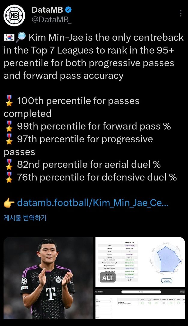통계매체 '데이터MB'는 지난 14일 자료 하나를 내놨다. 게시물에 태극기를 걸어놓고 김민재가 7대 빅리그(잉글랜드, 스페인, 이탈리아, 독일, 프랑스, 포르투갈, 네덜란드)에서 유일하게 공격적인 패스와 전방 패스 등 두 패스의 성공률 모두 95% 이상인 선수라고 설명한 것이다.