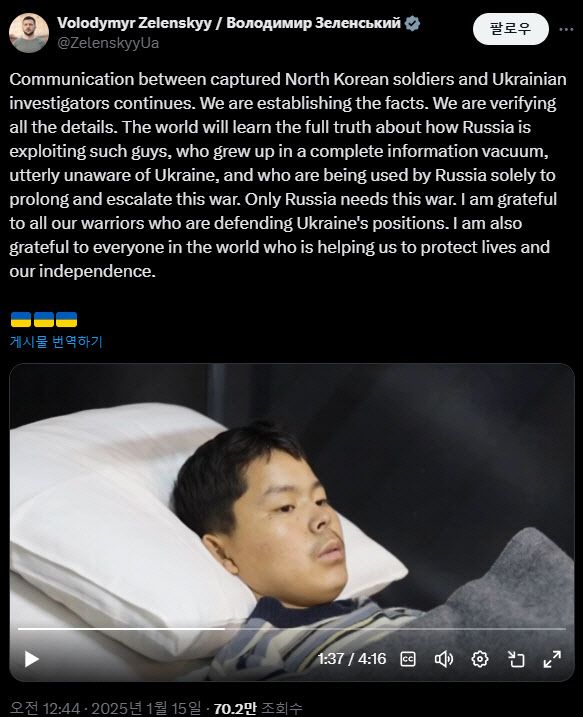 젤렌스키 대통령은 “포로로 잡힌 북한 군인들과 우크라이나 조사관들 간의 소통이 계속되고 있다”며 “우리는 사실을 확립하고 모든 세부 사항을 검증하고 있다”고 적었다.