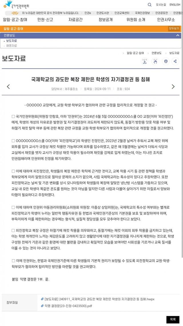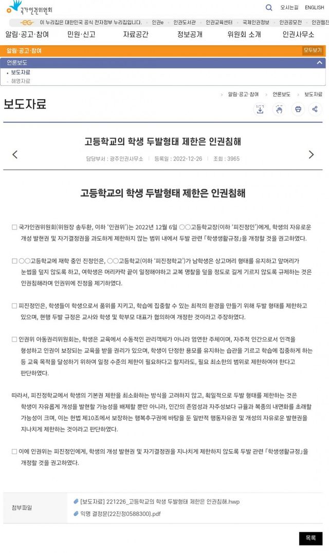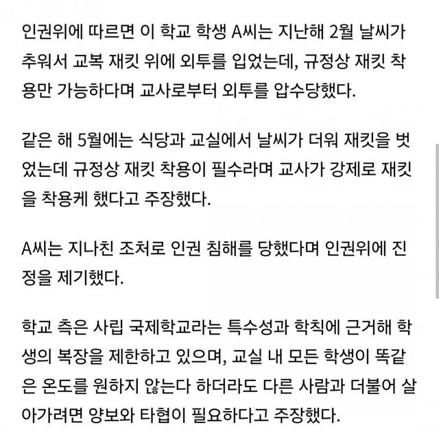 인권위, “교복 위에 외투 입는거 막으면 인권침해”