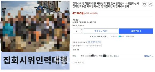 집회와 시위를 대신하는 인력대행사가 횡행하고 있다. 이데일리가 지난 14일 인터넷에 ‘집회 알바’를 검색하자 ‘광화문 집회 알바 인력’, ‘시위 인력 수급’이란 제목으로 작성된 인력대행사의 광고들이 확인됐다. 이들 업체는 3만~5만원씩 비용을 책정하고 의뢰인을 모집했다. ‘완벽한 비밀을 유지하며 처리해 드리겠다’며 ‘최소 5명에서 3000명 이상까지 가능하다’고 홍보하는 곳도 있었다.