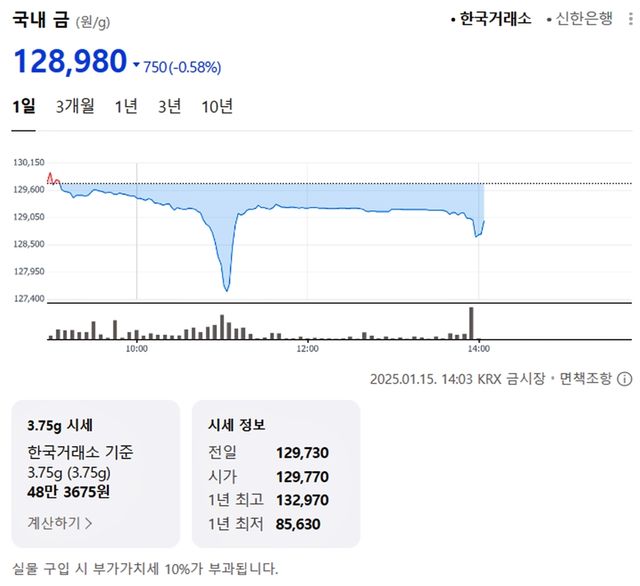 국내 금시세(금값)가 15일 오후 하락세(전 거래일 대비)를 보이고 있다.