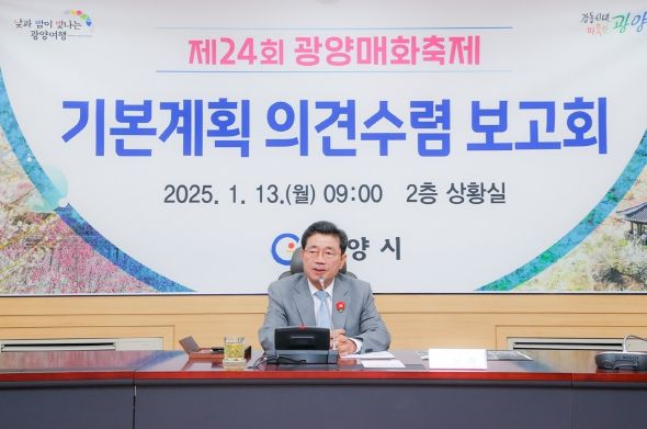 지난 13일 광양시청 상황실에서 정인화 광양시장을 비롯해 관계부서장 30여 명이 참석한 가운데 제24회 광양매화축제 기본계획(안) 의견수렴 보고회가 열렸다.