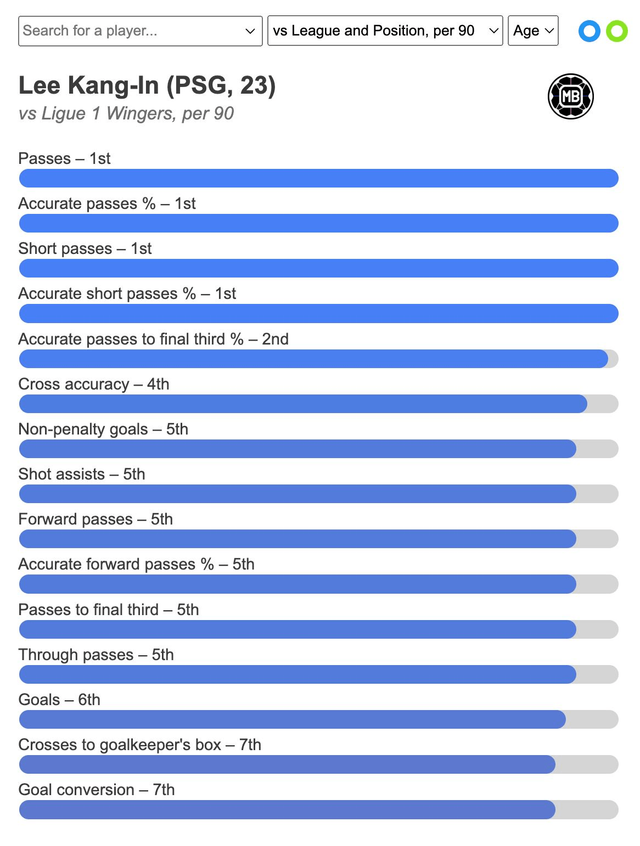 또 축구 통계 업체 DataMB에 따르면, 이강인의 올 시즌 리그1 윙어 중 90분 당 거의 최고의 공격 지표를 내고 있다. 패스와 패스 정확도, 짧은 패스 시도와 성공률 모두 전체 1위에 올랐고 파이널 써드(상대 페널티 박스 지역)로 향하는 패스 성공률 전체 2위, 크로스 정확도 4위, 비페널티킥 득점과 슛 도움, 전진 패스, 전진패스 성공률, 파이널써드 패스 시도, 스루패스 전체 5위, 득점 6위, 골키퍼 박스 안 크로스, 골 전환율이 전체 7위에 올랐다. 흠잡을 데 없는 리그 최고의 공격형 미드필더다.