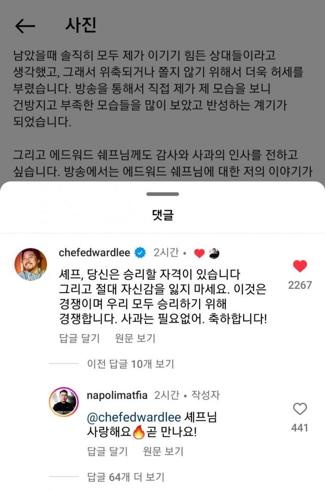 DM으로 이런저런 얘기가 나왔는지 사과문을 남긴 나폴리 맛피아 권성준 셰프와