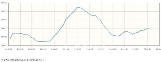 15일 한국관세물류협회에 따르면, 해상운임 척도로 꼽히는 컨테이너선 운임 지표인 상하이컨테이너운임지수(SCFI)는 지난 3일 기준 2505.17로 지난해 11월 22일 이후 6주째 상승세를 이어갔다. 1년 전(1896.65)엔 견주면 32.1% 높다. 예멘의 친(親)이란 후티 반군이 홍해를 지나는 선박을 공격한 ‘홍해사태’로 컨테이너선이 아프리카 희망봉으로 우회하고 있는 데다 중국발 밀어내기 물량이 급증한 여파로 풀이된다. 다만 지난주 내림세를 기록하며 7주만에 하락 전환했다.