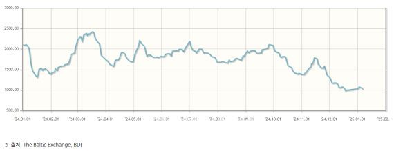 식품 원자재 수입의 경우 해상 운임비 상승 우려는 적다. 원자재는 주로 벌크선으로 수입되는데 벌크선 운임 수준을 나타내는 발틱건화물선지수(BDI)는 지난해 11월 15일 1785까지 올랐다가 연말에는 세자릿수(976)까지 추락한 뒤 소폭 반등해 지난 7일 1015에 머물러 있어서다. 벌크 화물 운임을 좌우하는 중국과 인도의 철광석·석탄 수요가 줄어든 영향이라는 분석이다.