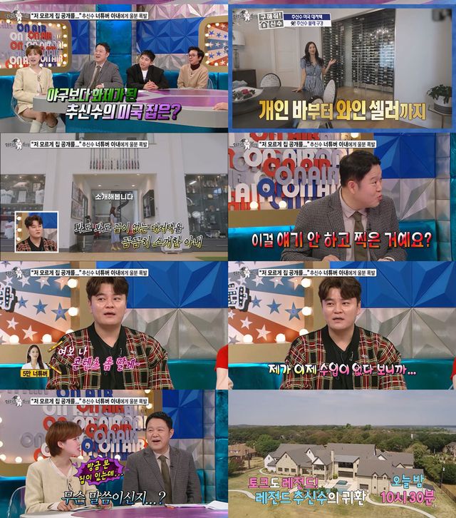 개인 바부터 영화관, 수영장, 농구장, 헬스장 등 리조트를 방불케 하는 대저택의 스케일에 모두가 놀란 가운데, 김구라는 “이걸 얘기 안 하고 찍은 거예요?”라고 질문을 던진다. 이에 추신수는 “여보, 나 콘텐츠 좀 딸게~”라고 당시 아내에게 들은 말을 따라 하기도 했다는 후문이다.