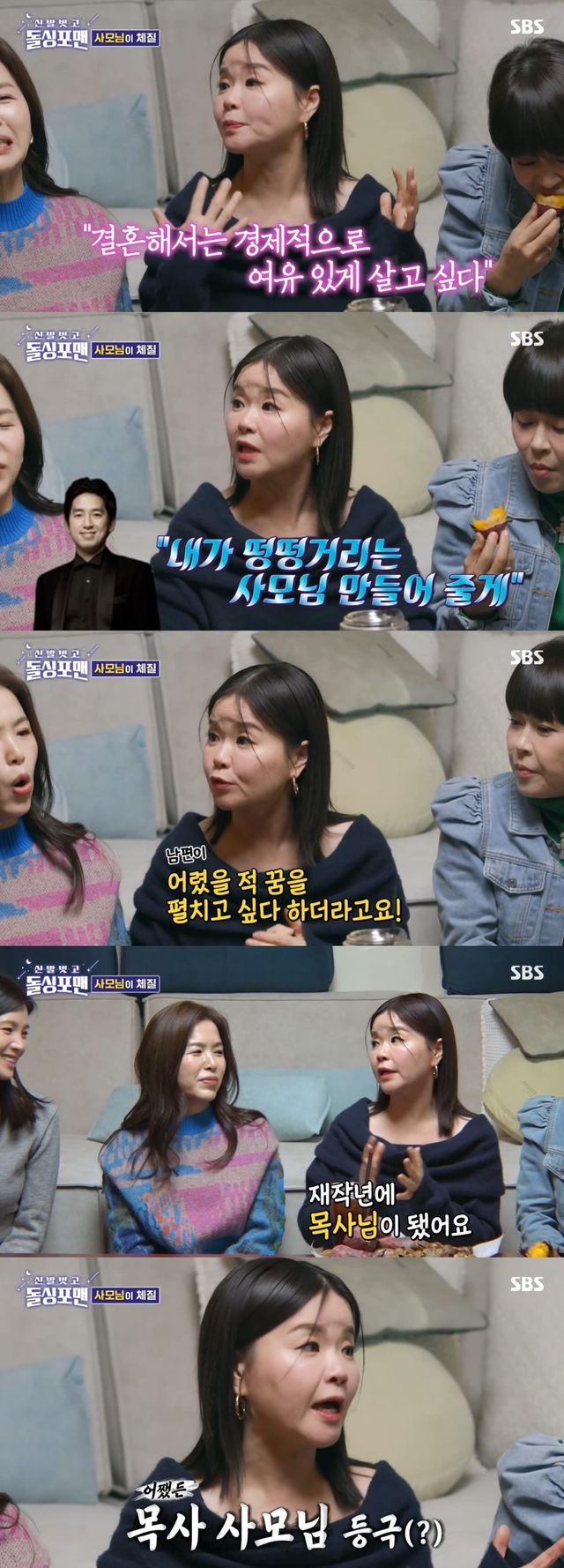그는 "사업이 결혼하고부터 잘 안 되더라. 남편이 열심히하는데 위기가 있었다"고 토로하며 "그러다 어느날 느닷없이 어릴적 꿈을 펼치고 싶다고 하더라. 그 꿈이 목사님이었다"고 밝혔다.