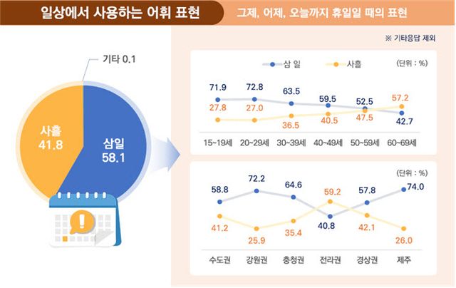 지역에 따라서도 달랐다. 그제, 어제, 오늘을 표현할 때 강원권과 제주에서는 ‘삼 일’이라는 표현을 선호한 반면 전라권에선 ‘사흘’의 사용이 상대적으로 높았다. 수도권이나 경상권은 ‘삼 일’을 더 많이 사용하면서도 ‘사흘’ 역시 비슷하게 즐겨 썼다.