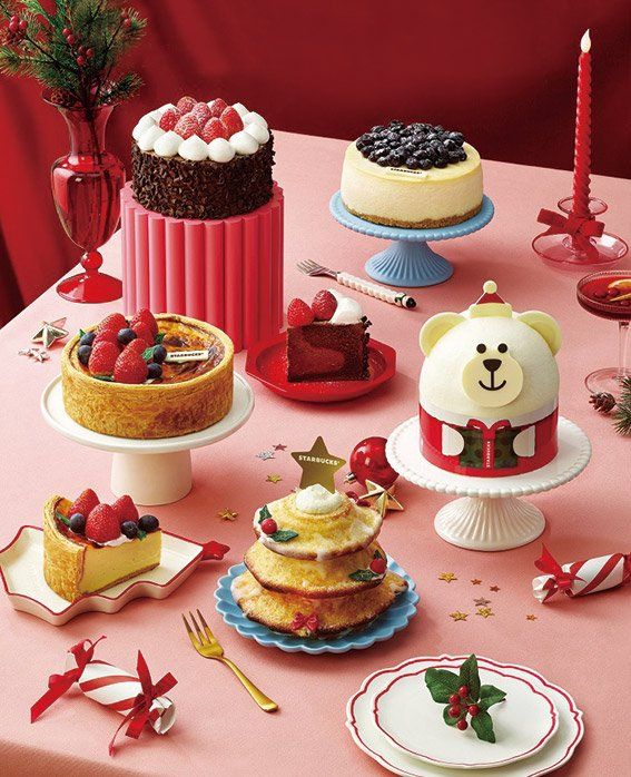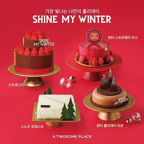 투썸프레이스 역시 ▲산타 비주얼을 완벽 구현한 ‘홀리데이 산타’ ▲흰 눈이 소복하게 쌓인 ‘윈터 베리 생크림’ ▲크리스마스 리스 장식이 포인트인 ‘샤이닝 리스 체리 생크림’ ▲홀리데이만의 트리 모양으로 꾸민 ‘스토로베리 요거트 트리’ ▲브라우니 시트에 붉은 코가 돋보이는 ‘초콜릿 브라우니 루돌프’ ▲동화 속 겨울 정원을 연상케 한 ‘스토로베리 샤를로뜨’ 등을 마련했다.
