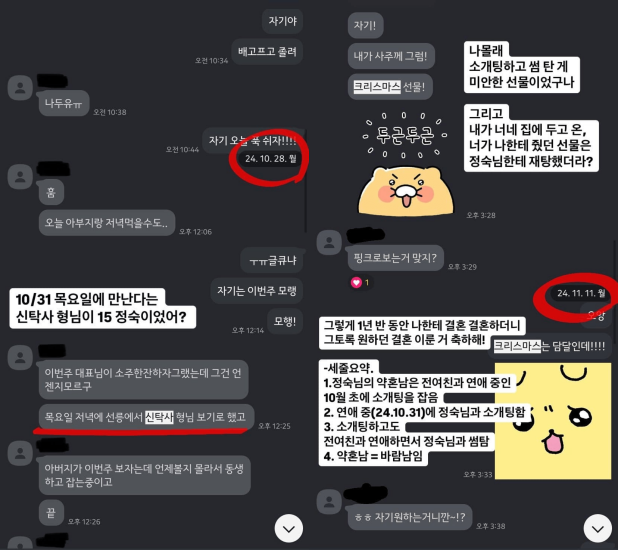 더불어 A씨는 정숙의 예비남편과 교제하던 시절 주고받은 대화 내용을 캡처해 공개했다. A씨는 해당 메시지를 주고받은 날짜를 동그라미로 표시하면서 "10월 31일 목요일에 만난다는 신탁사 형님이 15기 정숙이었어?"라고 분개했다. 또한 "내가 너네 집에 두고 온, 너가 나한테 줬던 선물을 정숙님한테 재탕했더라?"라고 폭로했다.