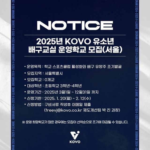 (엑스포츠뉴스 유준상 기자) 한국배구연맹(KOVO)이 학교 스포츠클럽 활성화와 배구 유망주 조기발굴을 위한 2025년 KOVO 유소년 배구 교실(서울 지역) 운영학교를 20일부터 2월 12일까지 이메일 접수를 통해 모집한다.