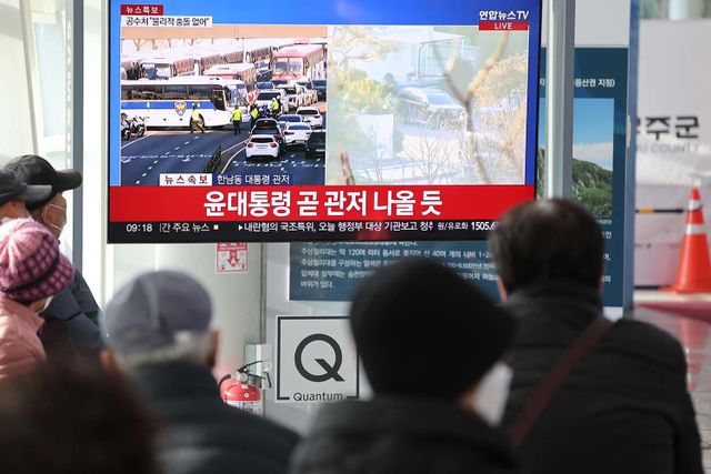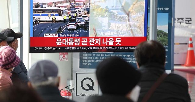 윤석열 대통령 체포영장이 집행됐을 때인 15일 오전 광주 송정역에서 시민들이 TV로 체포영장 집행 소식을 접하고 있다. / 뉴스1