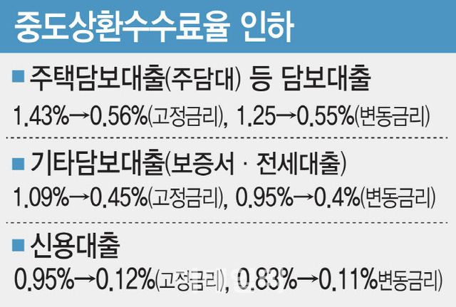 중도상환수수료는 차주가 3년 이내에 대출을 상환 금융사에 내는 수수료다. 금융당국은 그동안 구체적인 산정기준 없이 중도상환수수료를 부과했다며 자금운용 차질에 따른 기회비용, 대출 관련 행정·모집비용 등 실비용 내에서만 부과하라고 지도해왔다. 은행권은 중도상환수수료율 인하에 따라 2분기부터 수수료수익이 감소할 것으로 내다봤다.