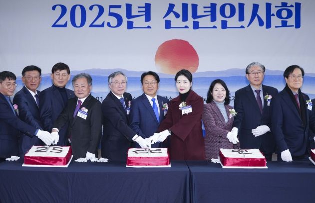 | ▲ 강기정 광주광역시장이 15일 오후 광주테크노파크에서 열린 ‘지산학연 협의체 신년인사회’에 참석해 김영집 광주테크노파크 원장, 시의원, 입주기업 대표 등과 떡케이크를 자르고 있다. |