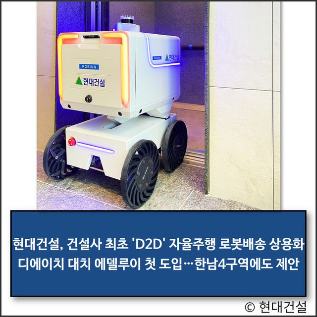 현대건설은 현대자동차그룹 스타트업 '모빈(Mobinn)'과 공동 개발한 실내외 통합 자율주행 로봇배송 서비스를 오는 6월 준공 예정인 '디에이치 대치 에델루이'에 첫 적용할 예정이다. 특히'D2D(Door to Door) 로봇 배송 서비스'의 공동주택 적용을 점차 확대해 나갈 계획이라고 지난 14일 밝혔다.